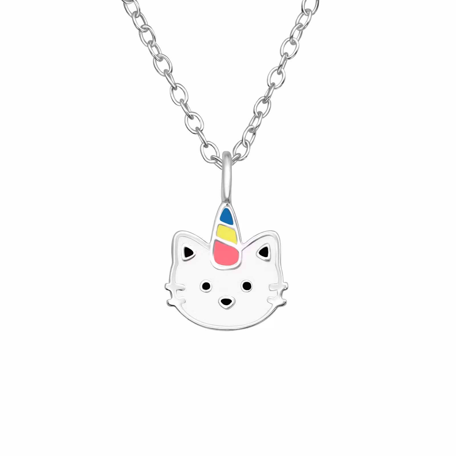 Sött halsband till barn i äkta 925 silver. Ett fint halsband med en liten, gullig Enhörning Katt så kallad Caticorn. Kedja medföljer, 36-39cm lång inklusive förlängningsdel. En kollektion med smycken i miniatyrstorlek som har fina och välgjorda detaljer.