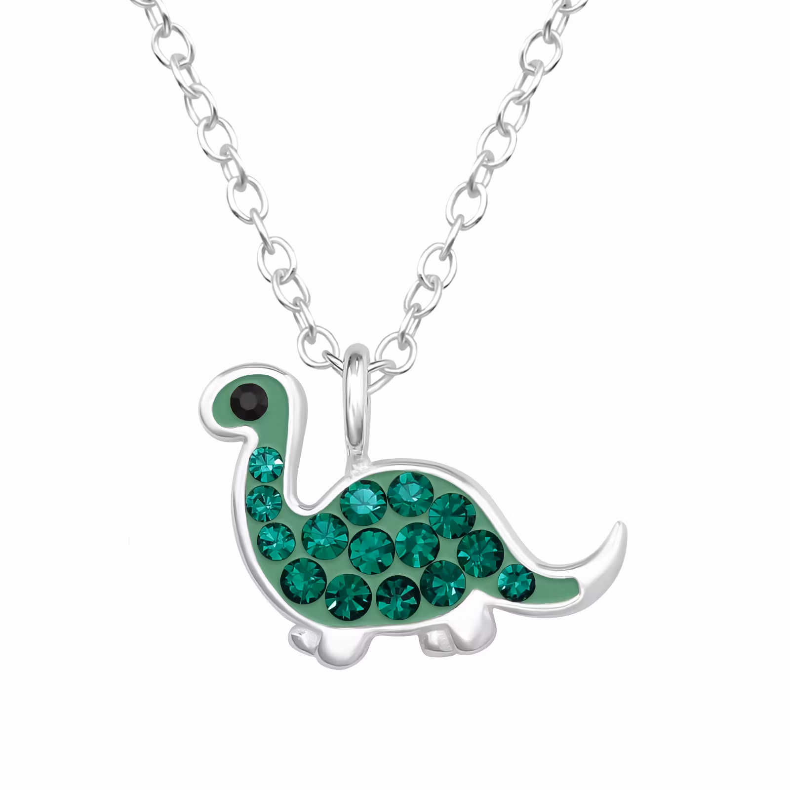 Sött halsband till barn i äkta 925 silver. Ett fint halsband med en liten, gullig, Dinosaurie i grönt. Kedja medföljer, 36-39cm lång inklusive förlängningsdel. En kollektion med smycken i miniatyrstorlek som har fina och välgjorda detaljer.