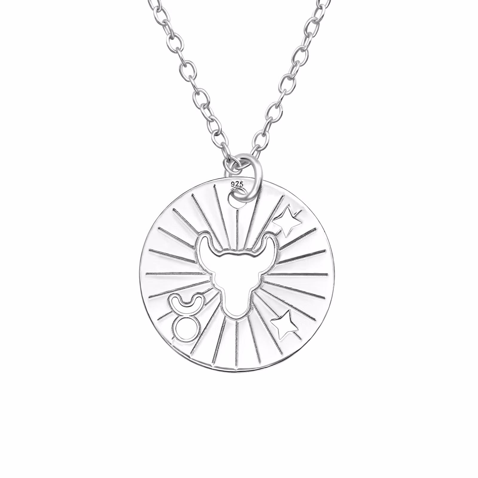 Silverhalsband med Stjärntecken Oxen (Taurus) motsvarande födelsedatum 20 april - 21 maj. Fint smycke med kedja och hängande smycke med bild av Stjärntecknet. Fri Frakt och Presentask!