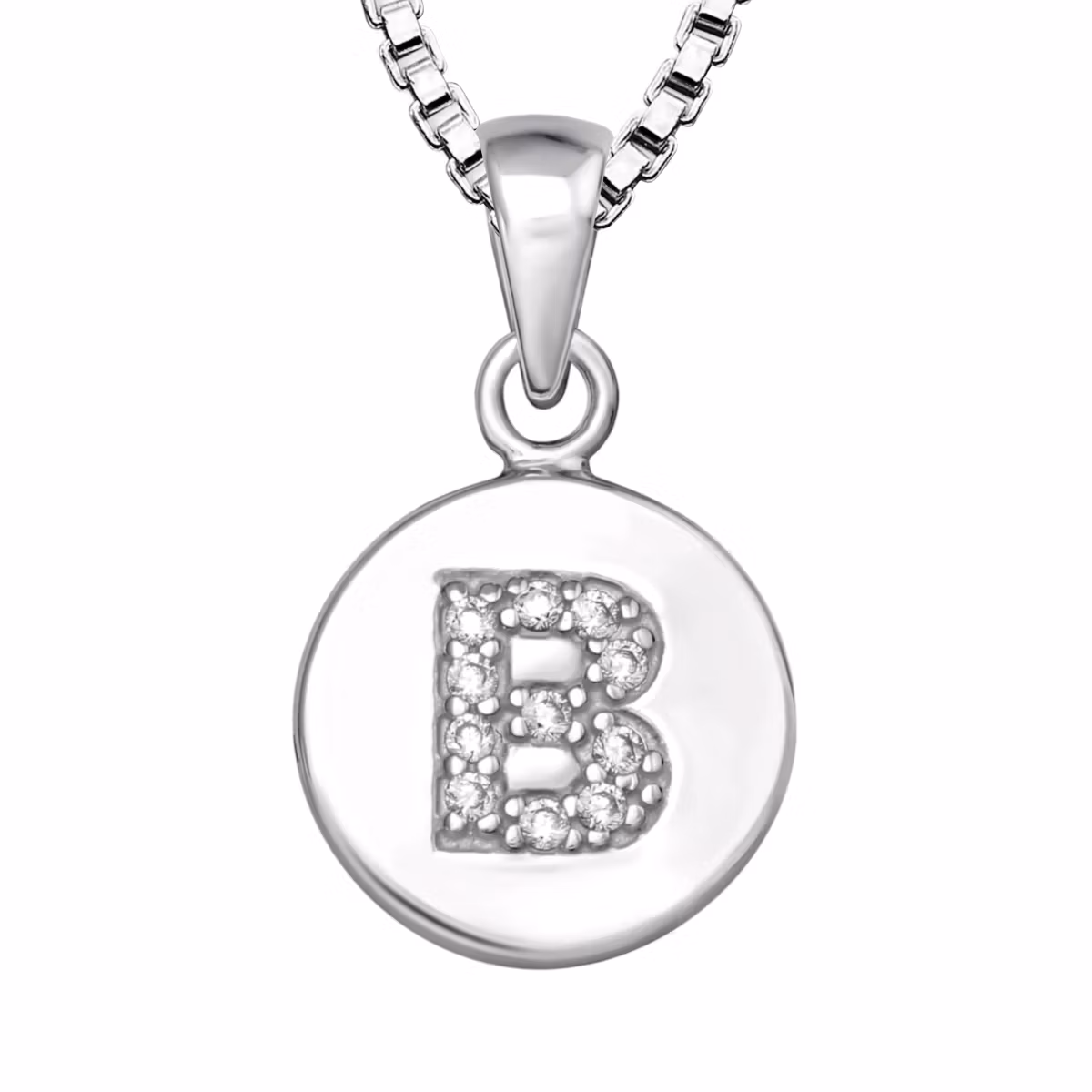 Fint bokstavshalsband i äkta 925 sterling silver som är fint till en pojke. Ett barnhalsband med bokstavsberlock B. En bokstav fylld med glittrande cubic zirkonia stenar. Kedja medföljer, 35cm lång. Ett välgjort silverhalsband som är lika fint att ge bort som present till barn eller vuxen.