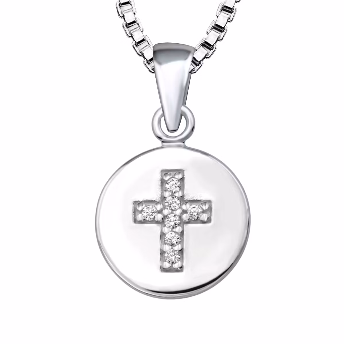 Fint barnsmycke i äkta 925 sterling silver som är fint till en pojke. Ett barnhalsband med platta som har ett kors på. Ett kors fyllt med glittrande cubic zirkonia stenar. Kedja medföljer, 35cm lång. Ett välgjort silverhalsband som är lika fint att ge bort som present till barn eller vuxen.