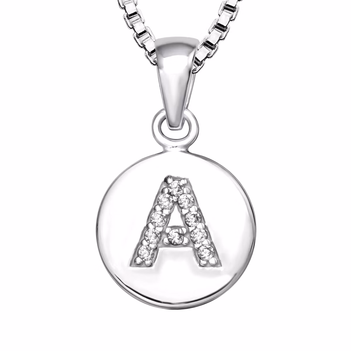 Fint bokstavshalsband i äkta 925 sterling silver som är fint till en pojke. Ett barnhalsband med bokstavsberlock A. En bokstav fylld med glittrande cubic zirkonia stenar. Kedja medföljer, 35cm lång. Ett välgjort silverhalsband som är lika fint att ge bort som present till barn eller vuxen.