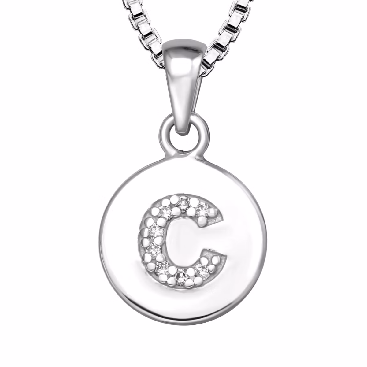 Fint bokstavshalsband i äkta 925 sterling silver som är fint till en pojke. Ett barnhalsband med bokstavsberlock C. En bokstav fylld med glittrande cubic zirkonia stenar. Kedja medföljer, 35cm lång. Ett välgjort silverhalsband som är lika fint att ge bort som present till barn eller vuxen.