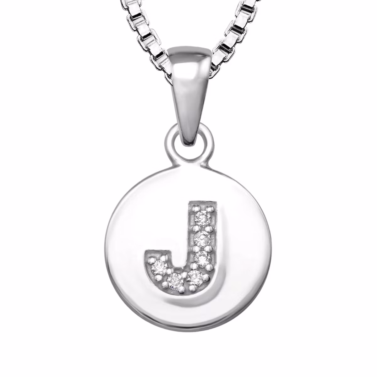 Fint bokstavshalsband i äkta 925 sterling silver som är fint till en pojke. Ett barnhalsband med bokstavsberlock J. En bokstav fylld med glittrande cubic zirkonia stenar. Kedja medföljer, 35cm lång. Ett välgjort silverhalsband som är lika fint att ge bort som present till barn eller vuxen.