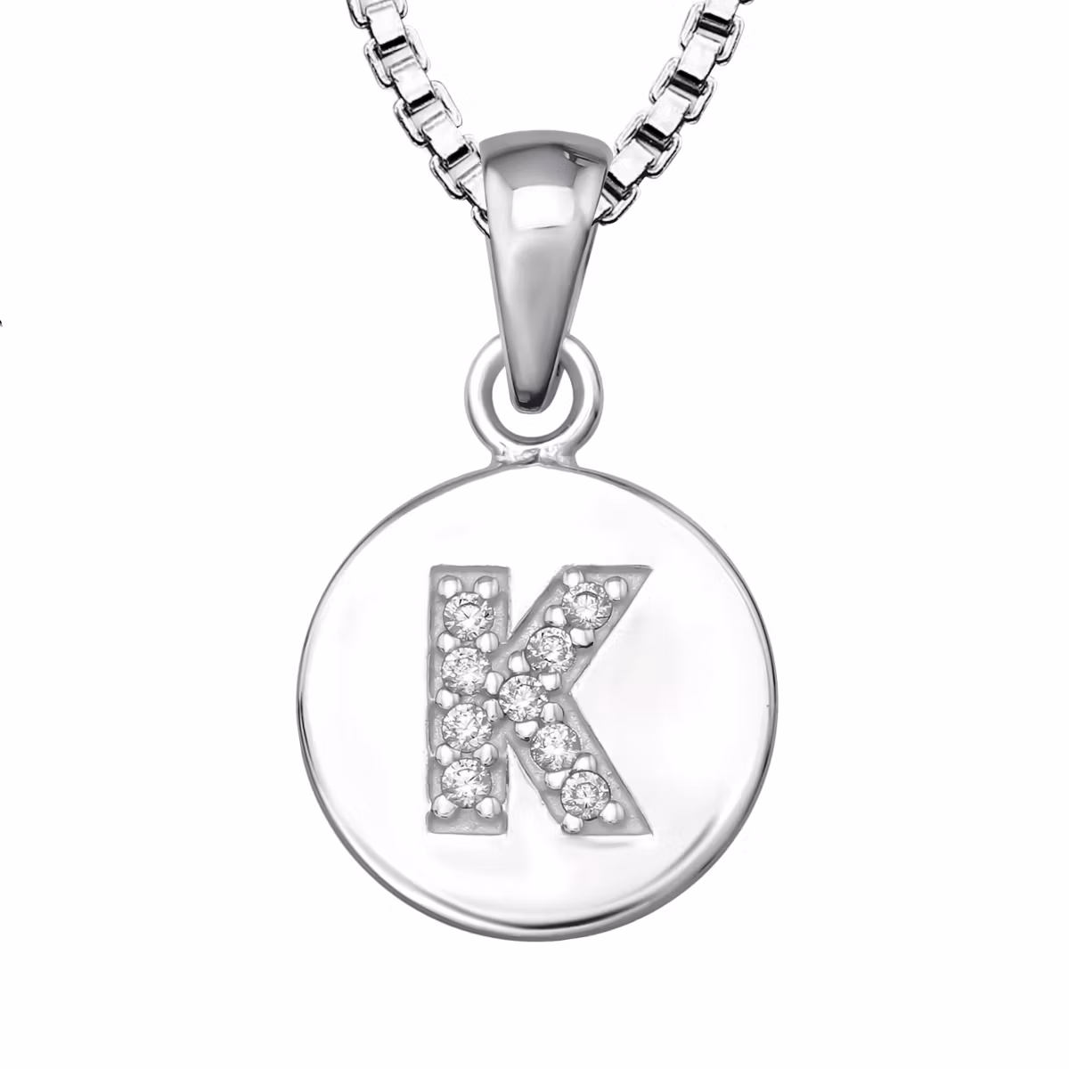 Fint bokstavshalsband i äkta 925 sterling silver som är fint till en pojke. Ett barnhalsband med bokstavsberlock K. En bokstav fylld med glittrande cubic zirkonia stenar. Kedja medföljer, 35cm lång. Ett välgjort silverhalsband som är lika fint att ge bort som present till barn eller vuxen.