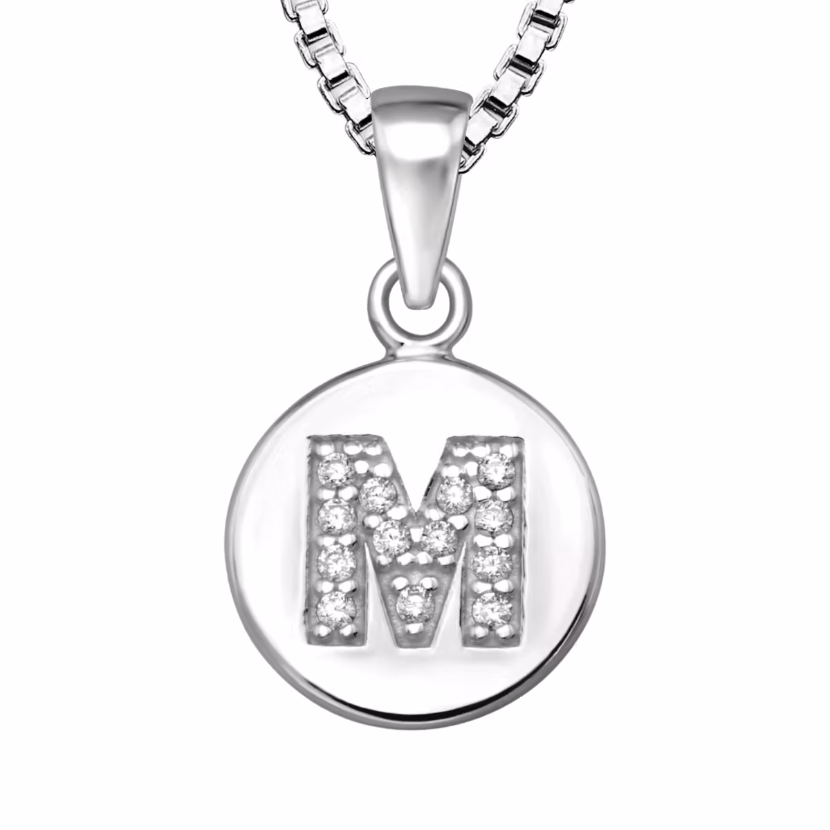 Fint bokstavshalsband i äkta 925 sterling silver som är fint till en pojke. Ett barnhalsband med bokstavsberlock M. En bokstav fylld med glittrande cubic zirkonia stenar. Kedja medföljer, 35cm lång. Ett välgjort silverhalsband som är lika fint att ge bort som present till barn eller vuxen.
