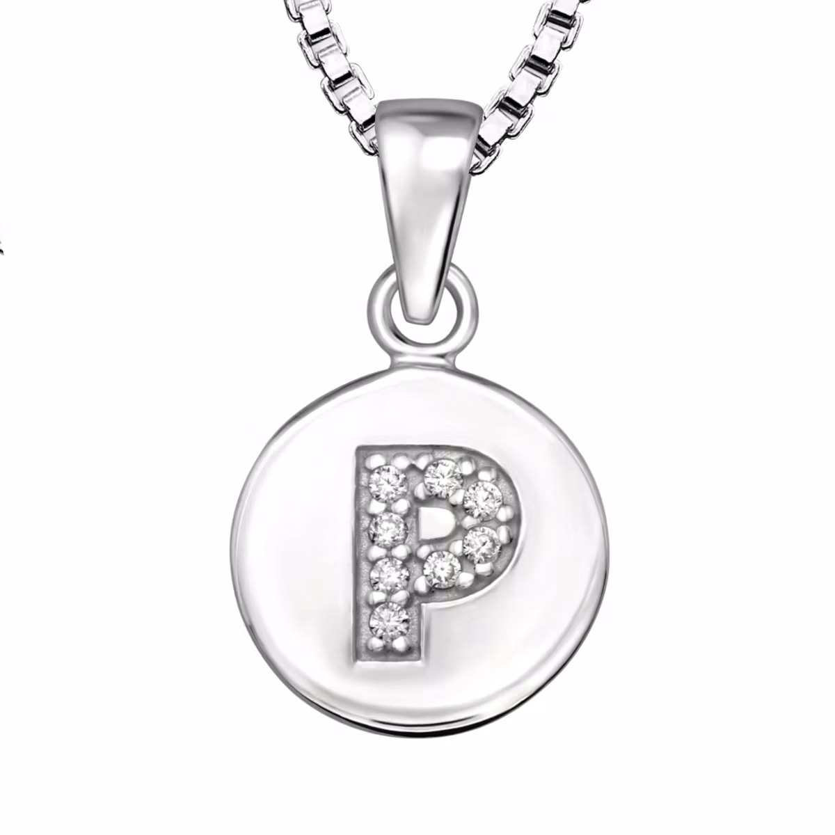 Fint bokstavshalsband i äkta 925 sterling silver som är fint till en pojke. Ett barnhalsband med bokstavsberlock P. En bokstav fylld med glittrande cubic zirkonia stenar. Kedja medföljer, 35cm lång. Ett välgjort silverhalsband som är lika fint att ge bort som present till barn eller vuxen.