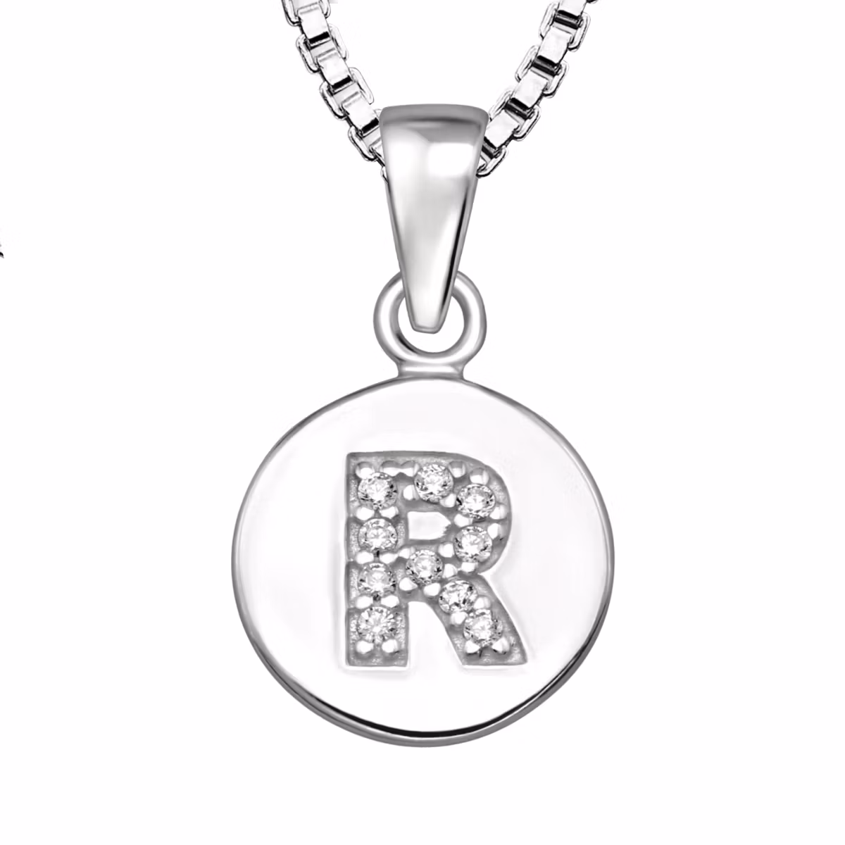 Fint bokstavshalsband i äkta 925 sterling silver som är fint till en pojke. Ett barnhalsband med bokstavsberlock R. En bokstav fylld med glittrande cubic zirkonia stenar. Kedja medföljer, 35cm lång. Ett välgjort silverhalsband som är lika fint att ge bort som present till barn eller vuxen.