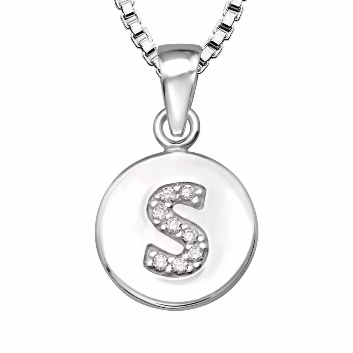 Fint bokstavshalsband i äkta 925 sterling silver som är fint till en pojke. Ett barnhalsband med bokstavsberlock S. En bokstav fylld med glittrande cubic zirkonia stenar. Kedja medföljer, 35cm lång. Ett välgjort silverhalsband som är lika fint att ge bort som present till barn eller vuxen.