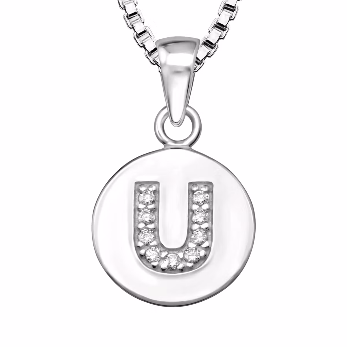 Fint bokstavshalsband i äkta 925 sterling silvers om är fint till en pojke. Ett barnhalsband med bokstavsberlock U. En bokstav fylld med glittrande cubic zirkonia stenar. Kedja medföljer, 35cm lång. Ett välgjort silverhalsband som är lika fint att ge bort som present till barn eller vuxen.