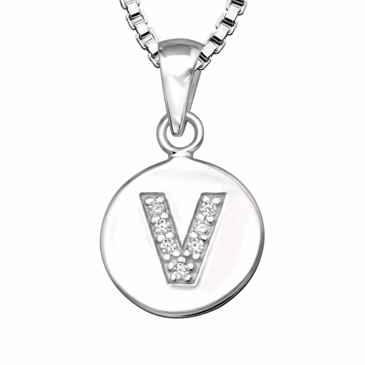 Fint bokstavshalsband i äkta 925 sterling silver som är fint till en pojke. Ett barnhalsband med bokstavsberlock V. En bokstav fylld med glittrande cubic zirkonia stenar. Kedja medföljer, 35cm lång. Ett välgjort silverhalsband som är lika fint att ge bort som present till barn eller vuxen.