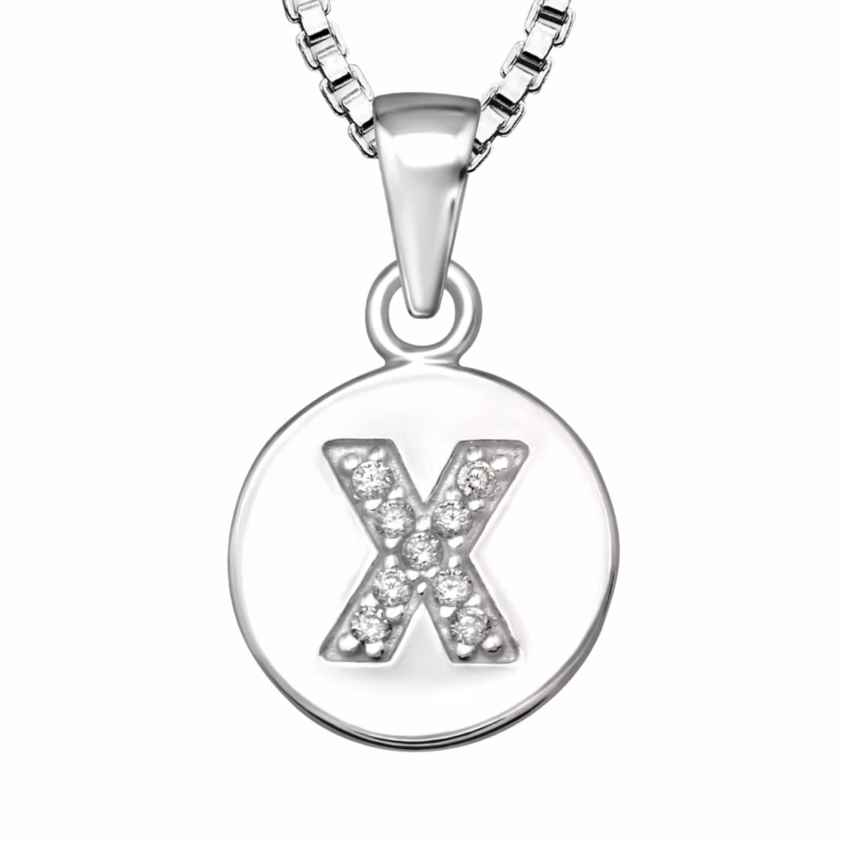Fint bokstavshalsband i äkta 925 sterling silver som är fint till en pojke. Ett barnhalsband med bokstavsberlock X. En bokstav fylld med glittrande cubic zirkonia stenar. Kedja medföljer, 35cm lång. Ett välgjort silverhalsband som är lika fint att ge bort som present till barn eller vuxen.
