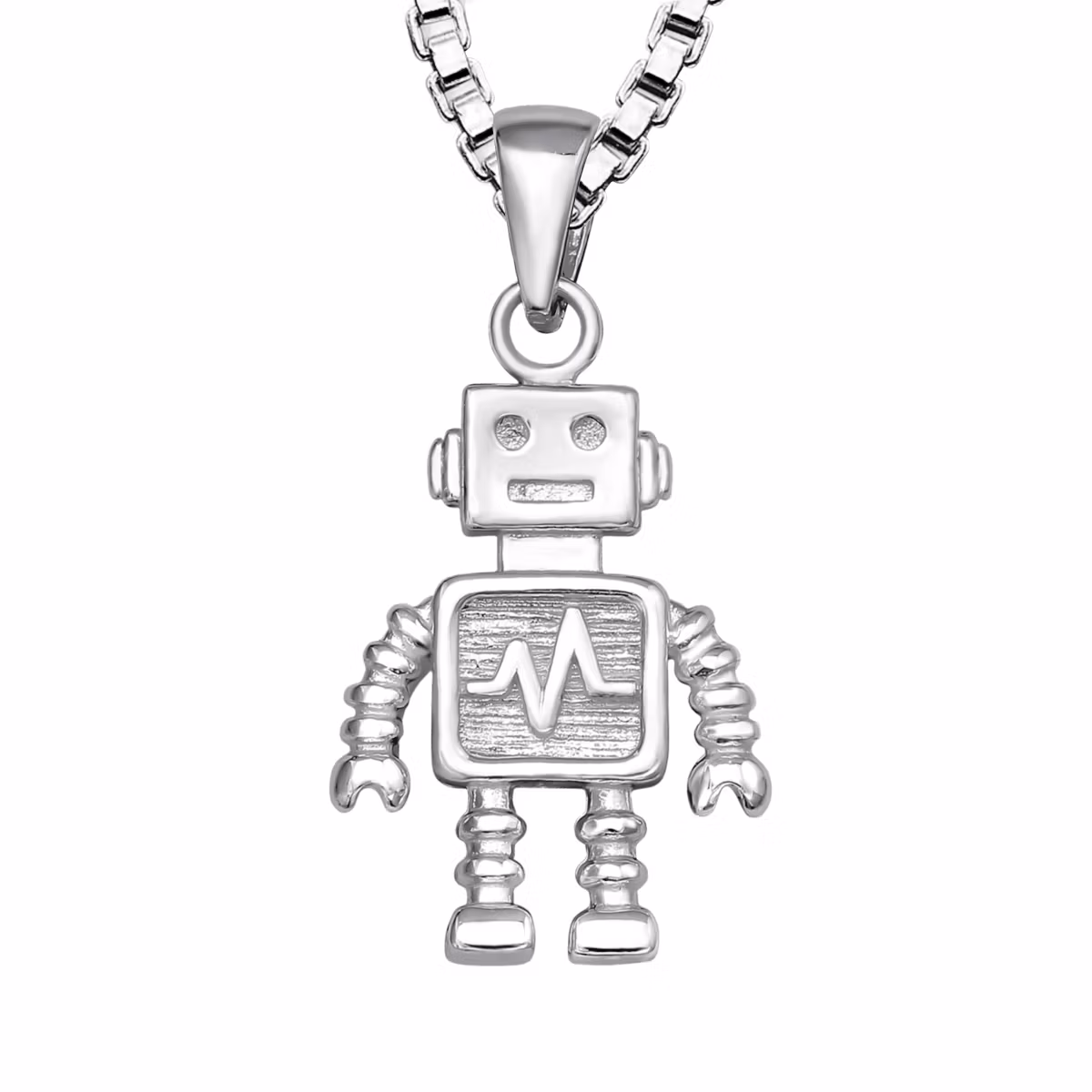 Fint halsband i äkta 925 sterling silver som passar bra till en pojke. Ett barnhalsband med en fin och detaljrik Robot, helt i silver. Kedja medföljer 35cm lång. Ett välgjort silverhalsband som är lika fint att ge bort som present till barn eller vuxen.