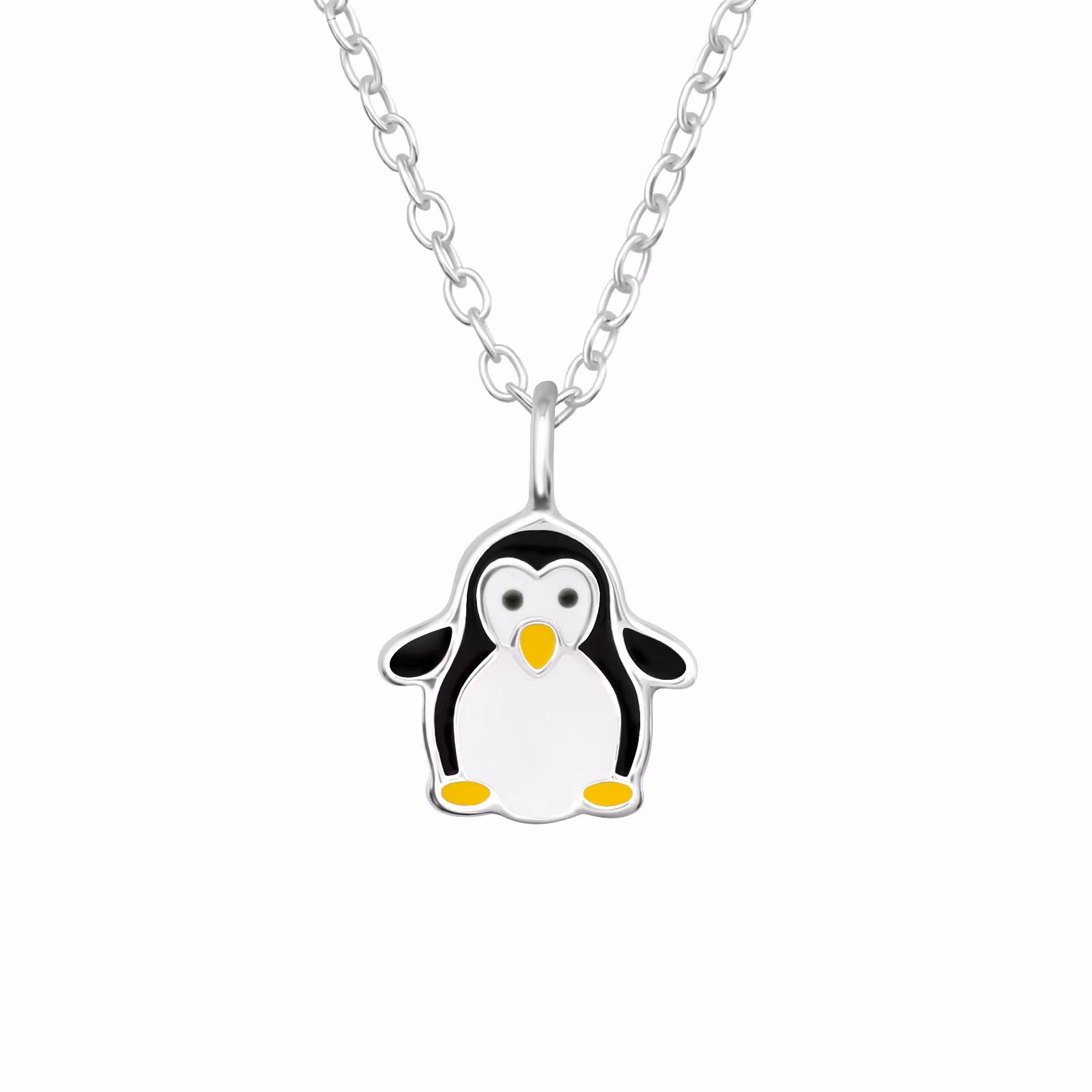 Sött halsband som är fint till en pojke i äkta 925 silver. Ett barnhalsband med en Pingvin i Svart/Vitt och gula detaljer. Kedja medföljer, 36-39cm lång inklusive förlängningsdel. En kollektion med smycken i miniatyrstorlek som har fina och välgjorda detaljer.