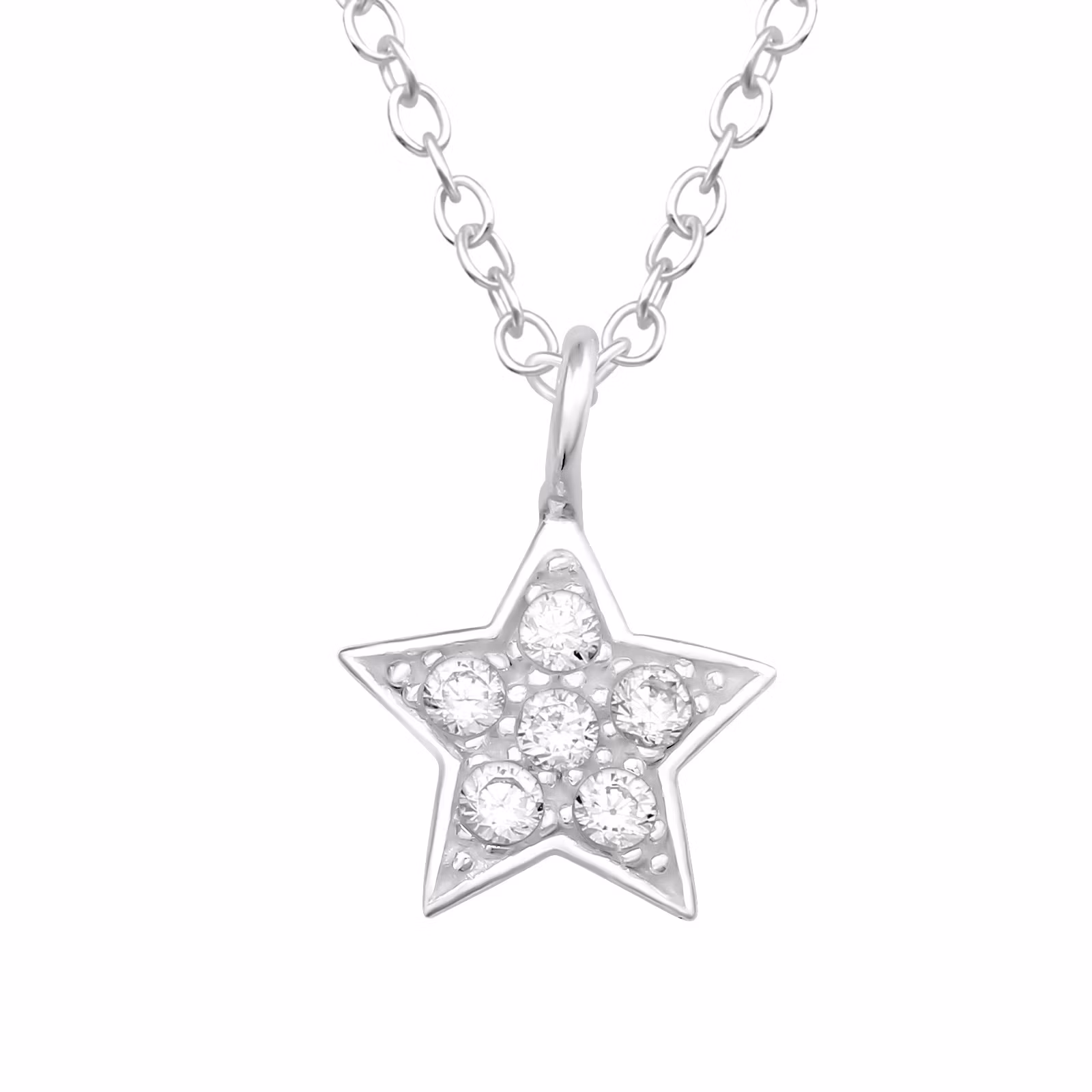Sött halsband som är fint till en pojke i äkta 925 silver. Ett barnhalsband med en Silverstjärna som har fem glittrande vita cubic zirkonia stenar. Kedja medföljer, 36-39cm lång inklusive förlängningsdel. En kollektion med smycken i miniatyrstorlek som har fina och välgjorda detaljer.