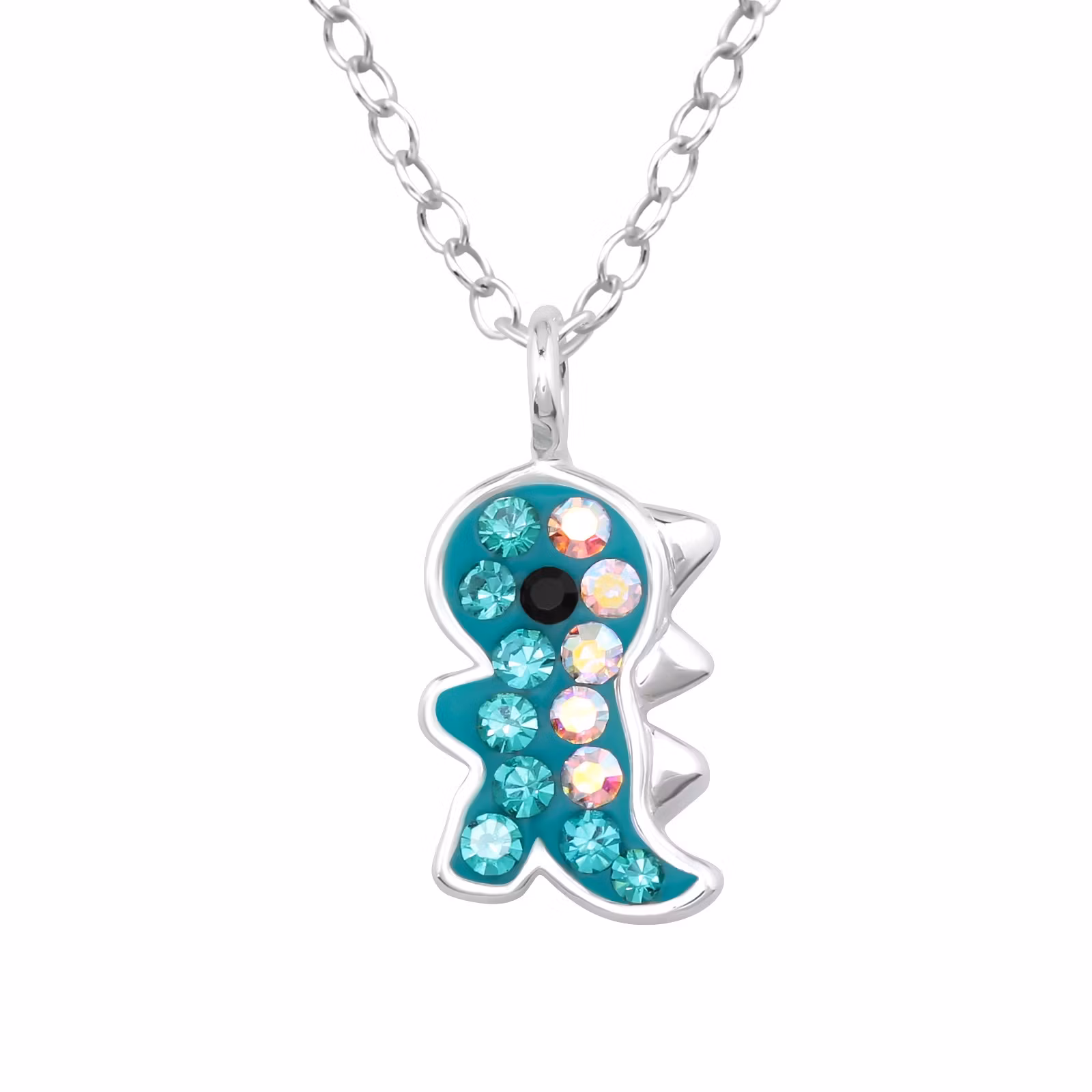 Sött halsband som är fint till en pojke i äkta 925 silver. Ett barnhalsband med en gullig, turkos, stående Dinosaurie. Kedja medföljer, 36-39cm lång inklusive förlängningsdel. En kollektion med smycken i miniatyrstorlek som har fina och välgjorda detaljer.