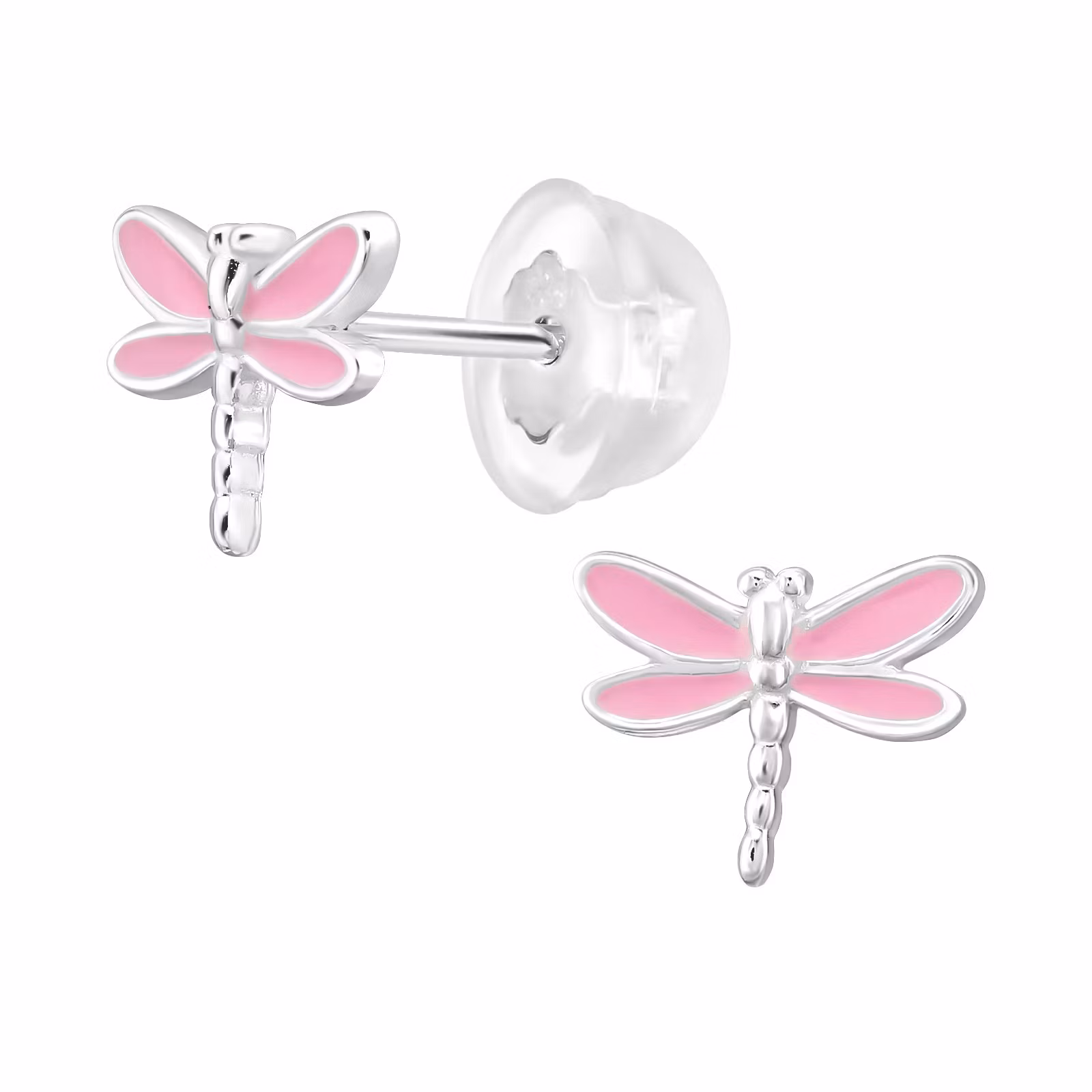 Söta djurörhängen till barn i äkta silver. Fina barnörhängen med små, gulliga Trollsländor i silver som har rosa vingar. Fri Frakt och Presentask! Dessa örhängen har bakploppar i silver som har ett överdrag i silikon så att örhänget smidigt och bekvämt sitter på plats.