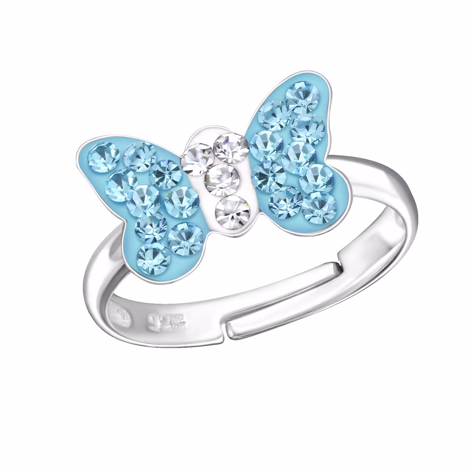 Söt ring till barn i äkta silver. Fin barnring med Fjäril i ljusblå färg, full med glittrande stenar. En justerbar ring. Fri Frakt och Presentask!