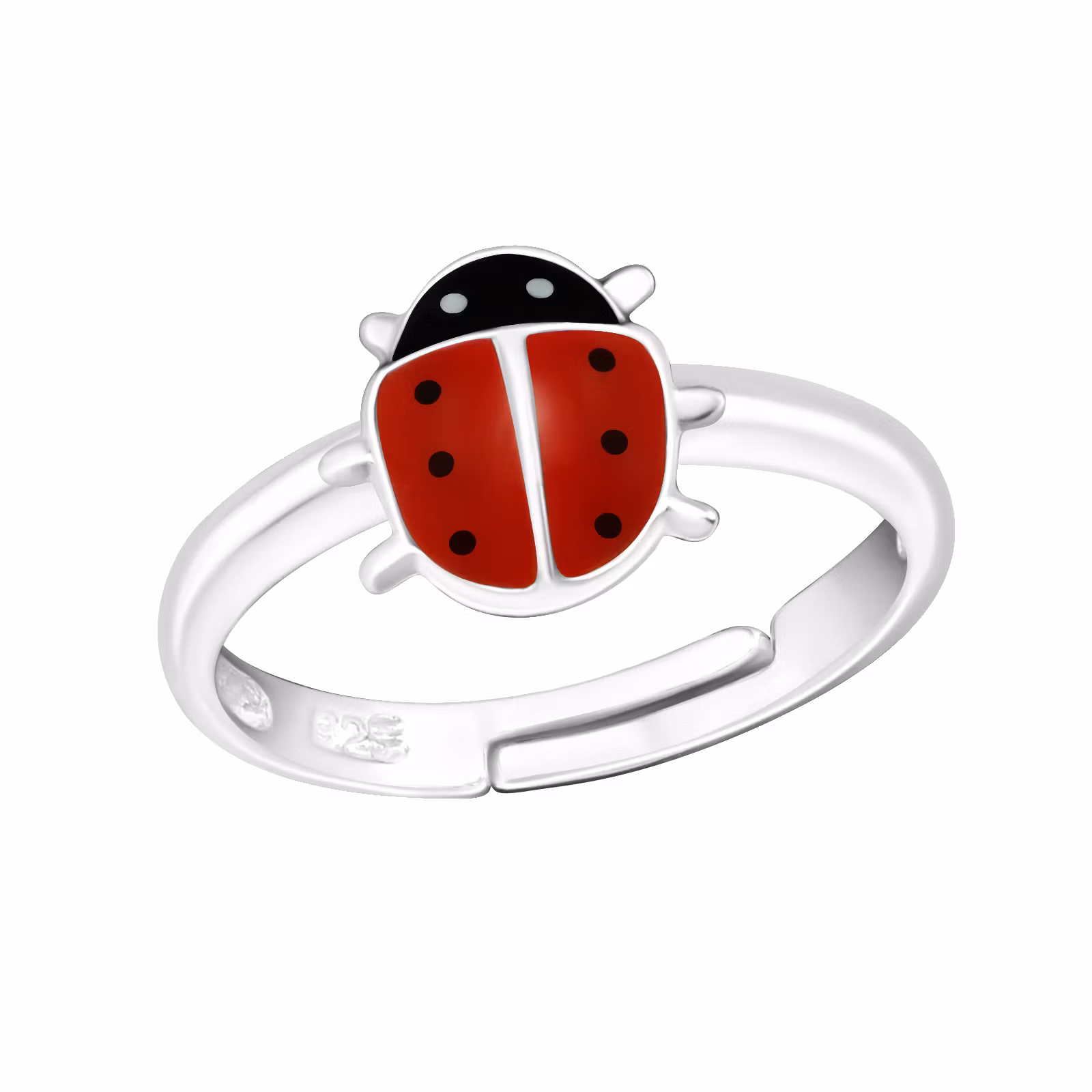 Söt ring till barn i äkta silver. Fin barnring med gullig Nyckelpiga i rött och svart. En justerbar ring. Fri Frakt och Presentask!