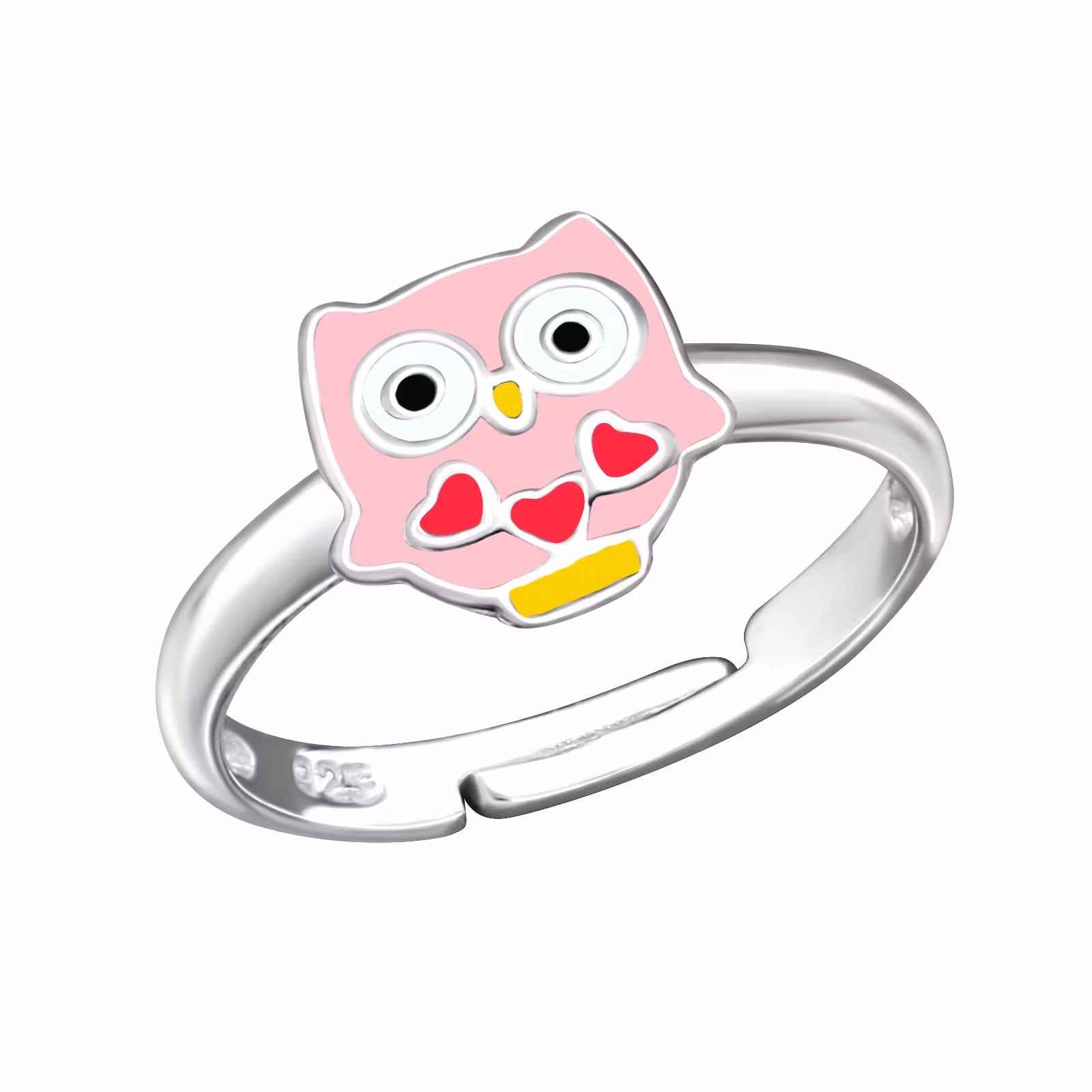 Söt ring till barn i äkta silver. Fin barnring med gullig, rosa Uggla. En justerbar ring. Fri Frakt och Presentask!