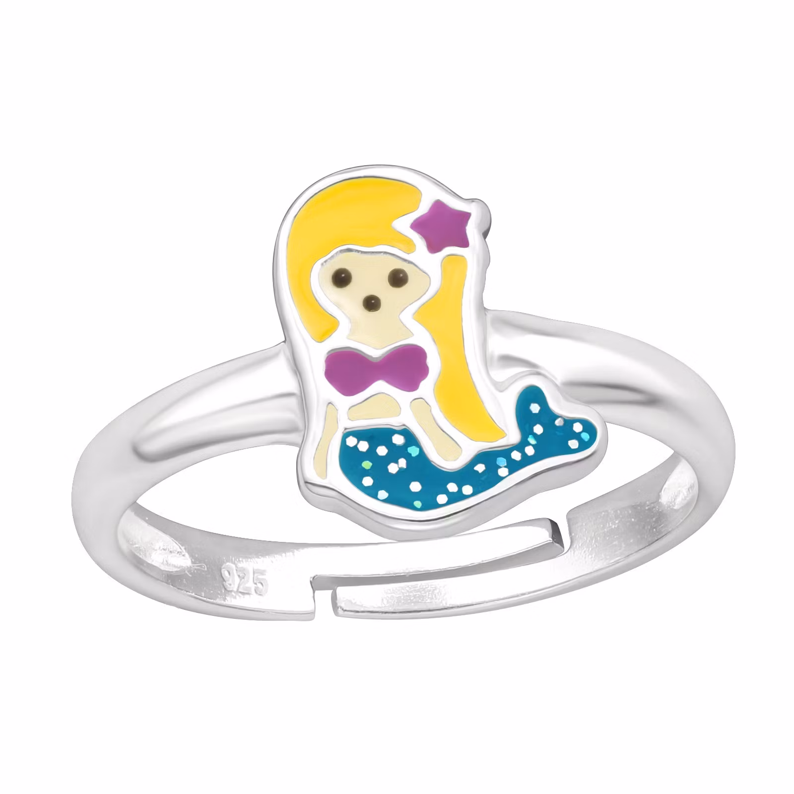 Söt ring till barn i äkta silver. Fin barnring med en Sjöjungfru som har en glittrig fena. En justerbar ring. Fri Frakt och Presentask!