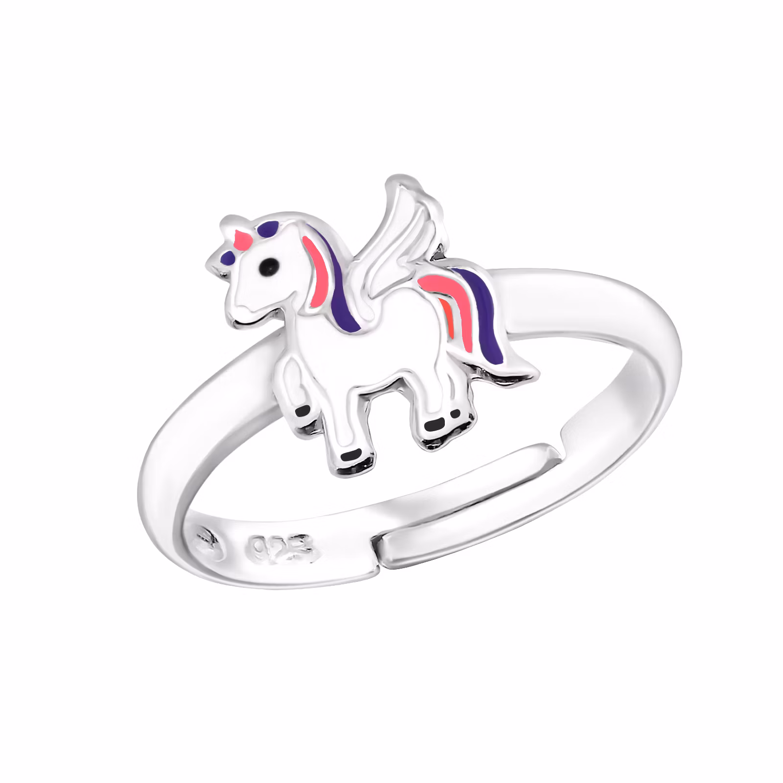Söt ring till barn i äkta silver. Fin barnring med Enhörning i vitt med detaljer i rosa och lila. En justerbar ring. Fri Frakt och Presentask!