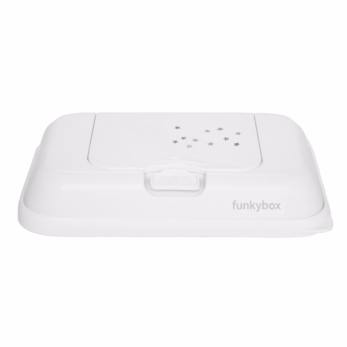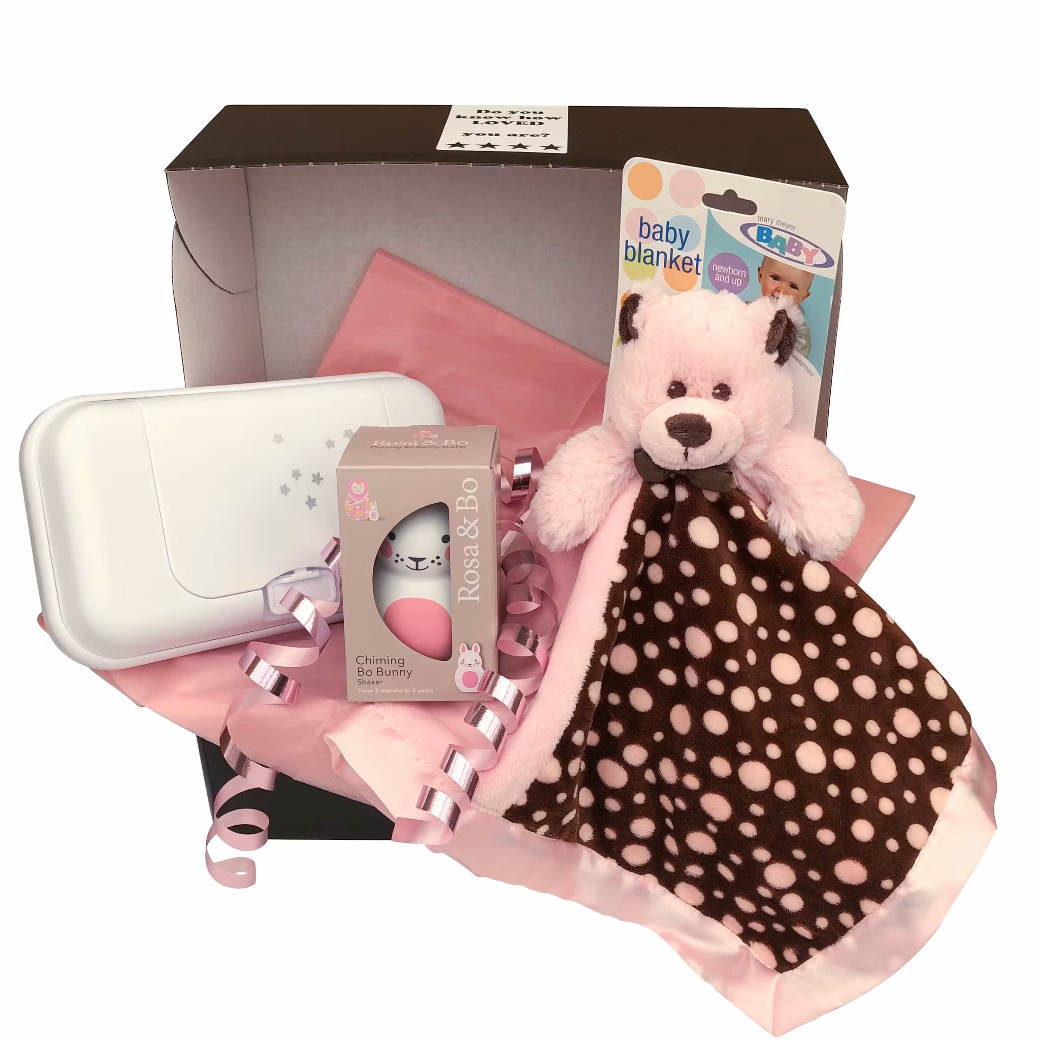 Här en ask innehållande en vit Funkybox ToGo ask, babyskallra kanin från Rosa & Bo och Snuttefilt Nalle rosa.