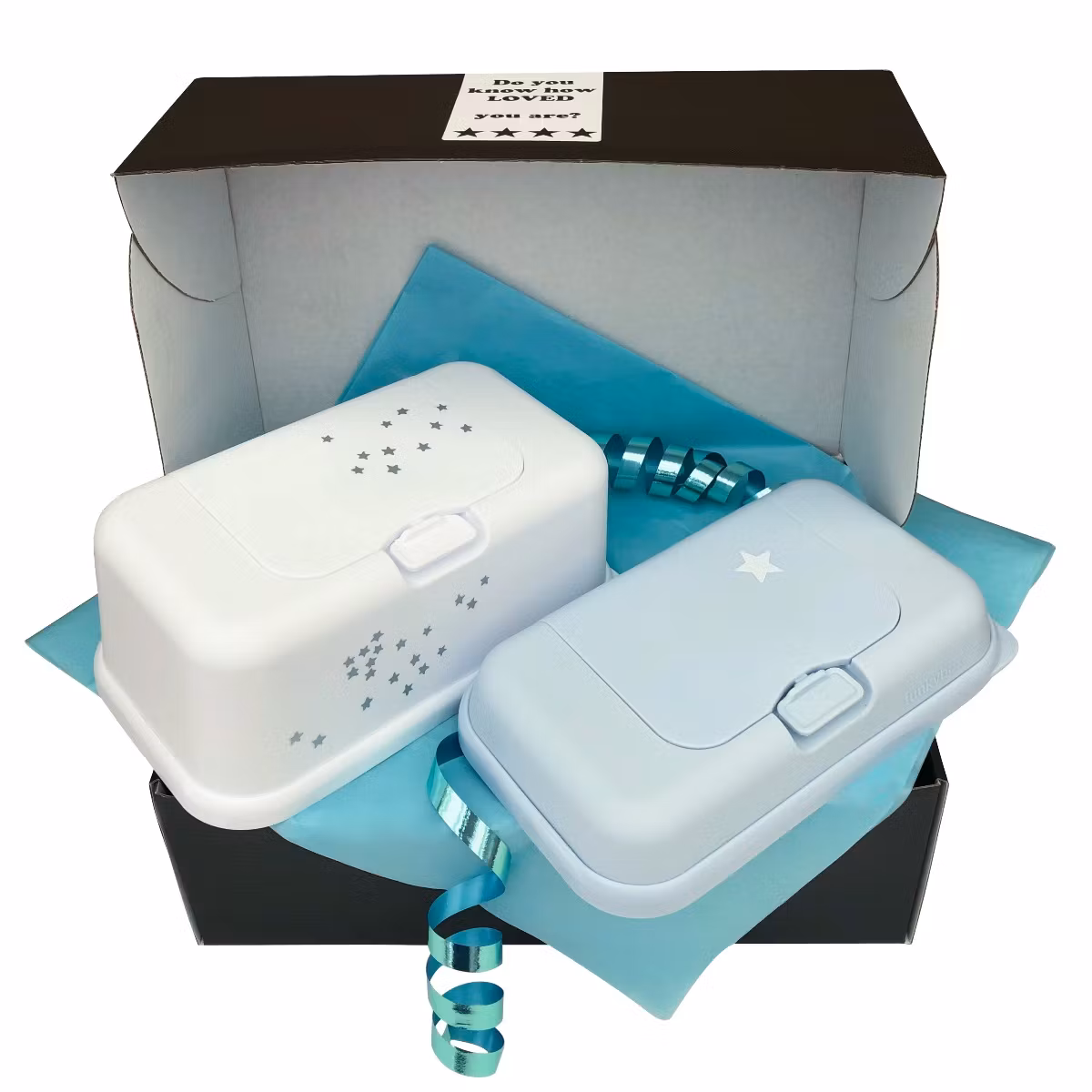 En presentask med två Funkybox, Little Stars Vit och en ToGo Pastellblå Stjärna, som är färdigpackad och klar att ge bort i present. Passar som gåva vid t.ex babyshower, till bebis, nyblivna föräldrar, dop, namngivning eller att köpa för att använda själv. En utmärkt present då de allra flesta föräldrar använder våtservetter. Det spelar heller inte någon roll om mottagaren redan skulle ha en Funkybox då man lätt kan använda flera på olika platser där det kan vara bra att ha en våtservett när till hands.