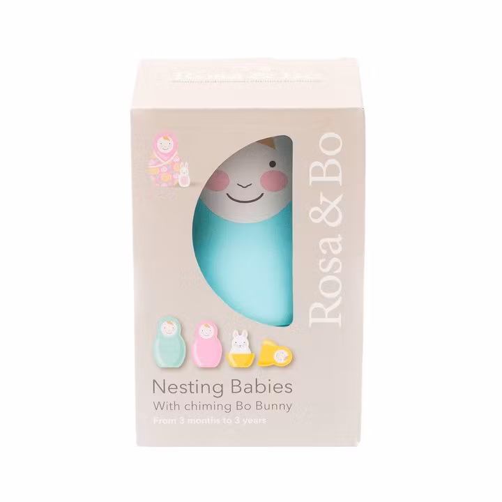 Rosa & Bo är en fin detalj i barnrummet, föräldern kan demonstrera leksaken för den yngre bebisen och det lite äldre barnet kan med spänning upptäcka funktionen själv. Spänningen stegrar när det finns ännu en söt bebis inuti den första och därefter ytterligare en till innan den söta skallrande kaninen Bo dyker upp som en glad överraskning i mitten.