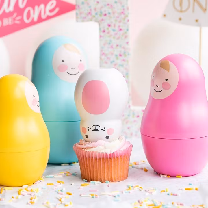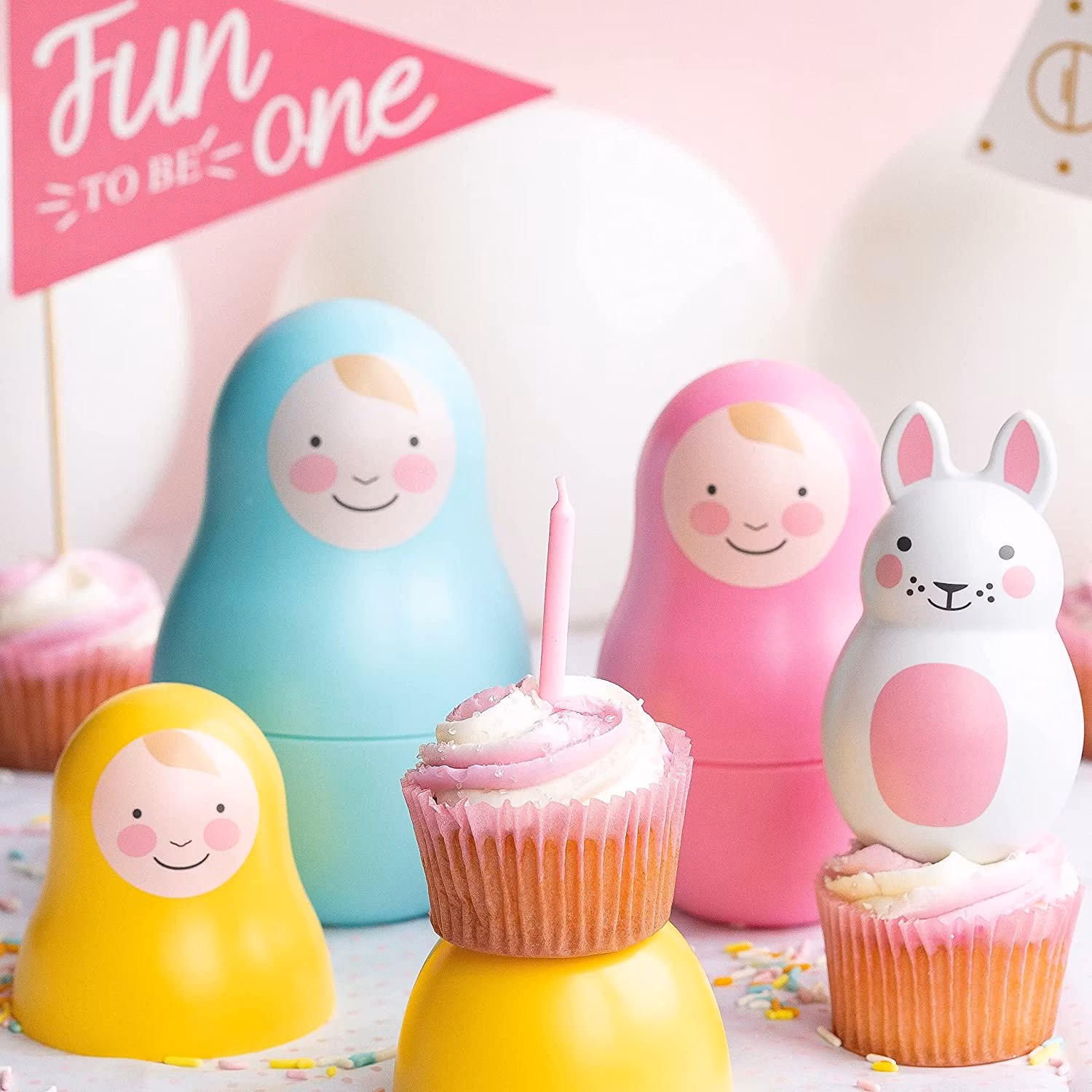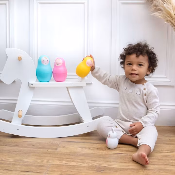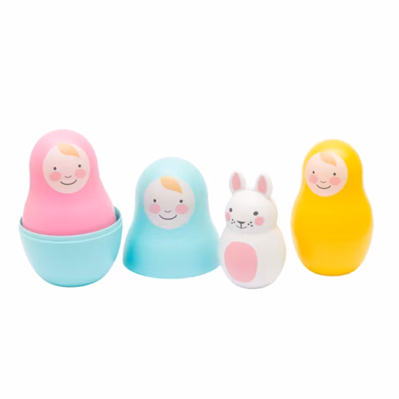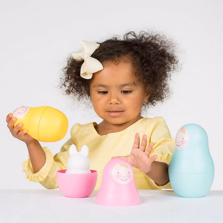 En designad, prisbelönt babyleksak med tre överraskningsdockor och en fin kaninskallra i mitten.