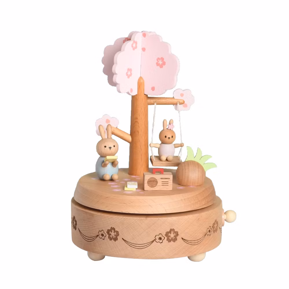 Fantastiskt söt speldosa tillverkad i trä med två gulliga kaniner. Den större läser en bok och den mindre gungar. Snurrar runt till en söt melodi när man vrider upp den undertill. Välgjorda små detaljer och riktigt bedårande att titta på. På/Av knapp så att man kan stänga av den utan att vänta tills den spelat klart.
