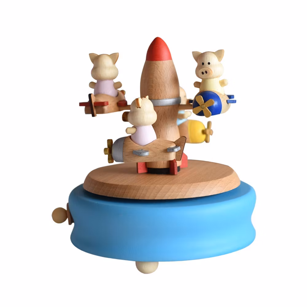 Fantastiskt söt speldosa tillverkad i trä med tre ljuvliga grisar i varsitt flygplan som åker karusell till en söt melodi när man vrider upp den undertill. Välgjorda små detaljer och riktigt bedårande att titta på. På/Av knapp så att man kan stänga av den utan att vänta tills den spelat klart.