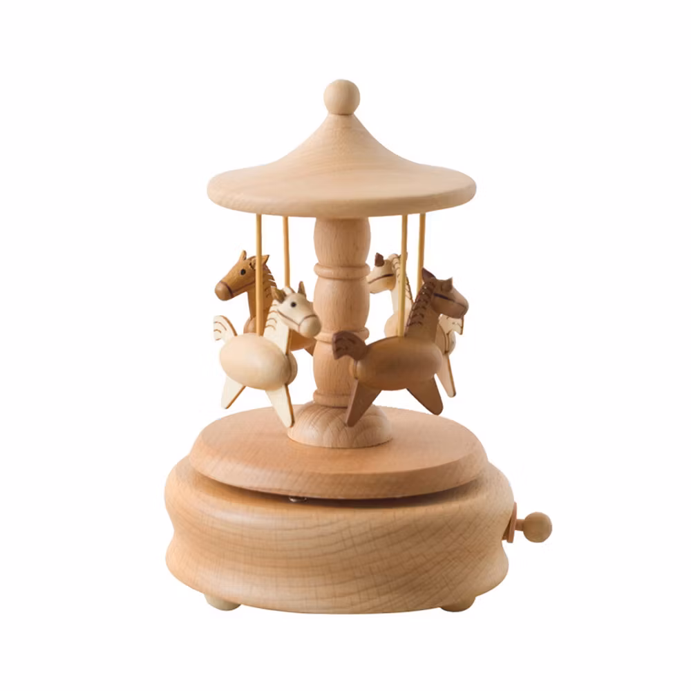 Riktigt fin speldosa tillverkad i trä med fyra hästar i två olika färgnyanser. Speldosan vrids upp genom att överdelen snurras och då åker hästarna runt på karusellen till en söt melodi. Välgjorda detaljer och riktigt söt att titta på. På/Av knapp så att man kan stänga av den utan att vänta tills den spelat klart.