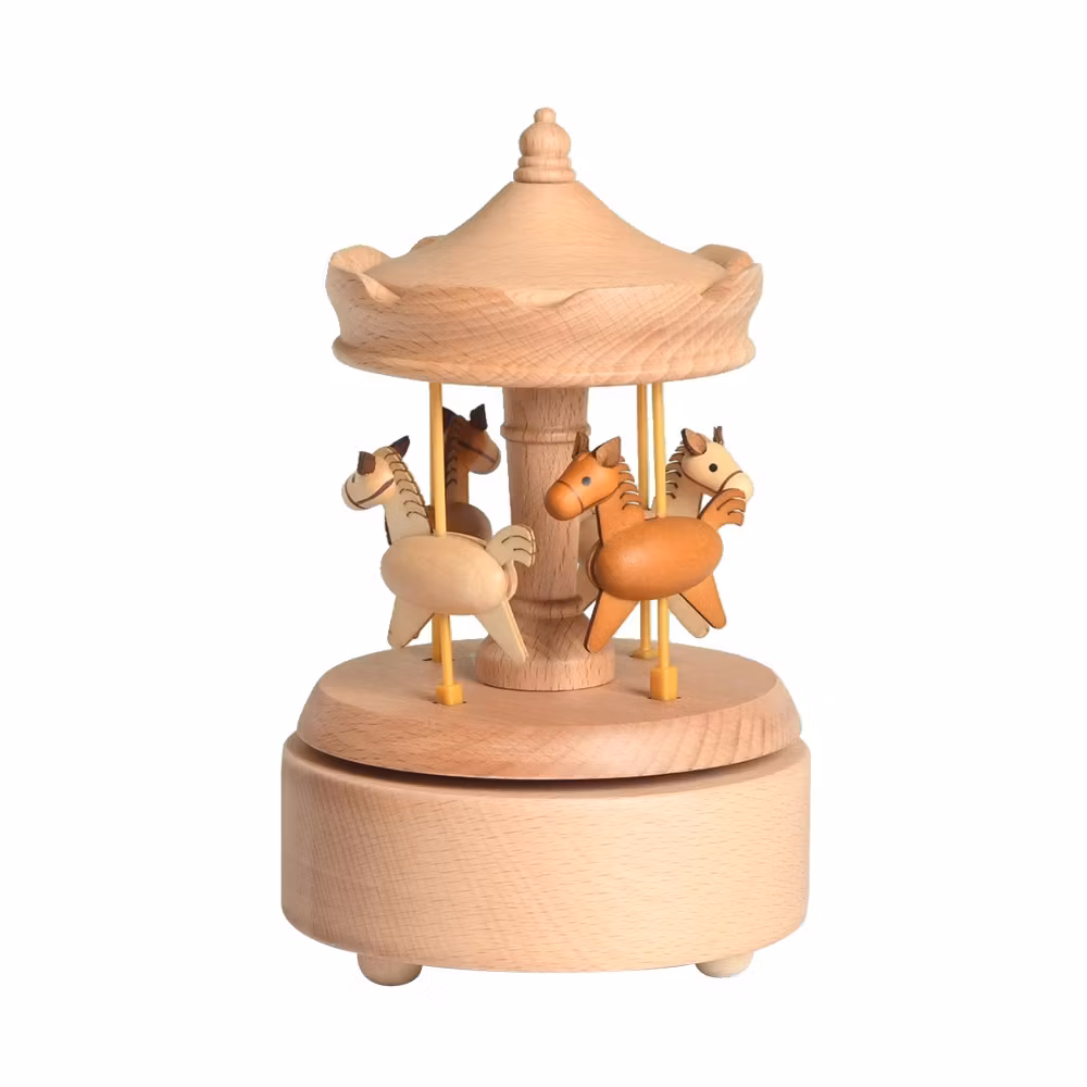 Fantastiskt fin speldosa tillverkad i trä som en karusell med fyra hästar i två olika färgnyanser som åker runt till en söt melodi när man vrider upp den undertill. Välgjorda detaljer och riktigt söt att titta på. På/Av knapp så att man kan stänga av den utan att vänta tills den spelat klart. På den här modellen rör sig hästarna även upp och ner när speldosan är på och snurrar runt. Det hörs då ett ljud av mekaniken som driver detta utöver musiken. Vet man med sig att detta kommer att störa så är det bättre att välja någon av alla de andra fina varianterna.